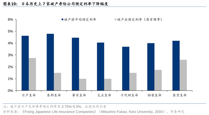 破产后允许下调存量预定利率,历史上破产寿险公司普遍下调2~3pcts。根据历史案例,日本寿险业于1997~2001年破产的7家公司,预定利率均有较大程度下降,普遍下降2~3pcts。以第一家破产的寿险公司日产生命为例,存量保单预定利率由3.75~5.5%下降至2.75%。一般情况下,趸交保险的预定利率下降幅度较小,储蓄型产品的下降幅度较大。此外,对于预定利率较高的合同,降低幅度会较大。