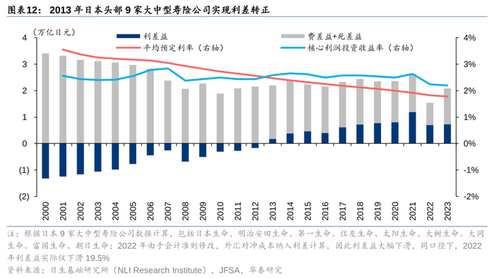 联动机制降低日本寿险业的负债成本,助力行业走出利差损。新的联动机制推动日本寿险业预定利率逐步下调。2000-2022年,9家主要寿险公司新业务平均预定利率从2.00%降至不足0.25%,整体业务平均预定利率则从3.55%降至1.82%。尽管资产端投资收益率基本保持稳定,通过持续降低负债成本,9家日本寿险公司于2013年实现利差转正,且利差益持续扩大,成为利润增长的重要驱动力。