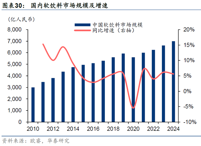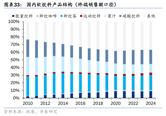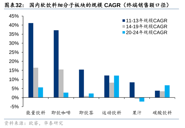 2014年后量增红利趋弱,我国软饮行业进入稳步发展阶段,结构性机遇仍存。2013年前,中国软饮料行业仍然处于量增红利的释放期,这一阶段国内软饮料企业依托细分品类从无到有的开拓、渠道端的全国化拓张实现快速增长,并逐步完成了软饮料产品多品类、全国化的渗透。据欧睿,11-13年国内软饮料销售额/销售量CAGR分别达到13%/9%,其中能量饮料/即饮咖啡/即饮茶/运动饮料细分赛道销量CAGR分别达到41%/37%/15%/12%,增长表现更加亮眼。2014年以来,软饮料市场量增红利趋弱,行业逐步从增量抢夺过渡至结构性机遇挖掘。在这一阶段,一方面行业增量红利趋弱,另一方面消费者差异化、个性化需求更加旺盛,供需两端压力之下企业面临更加激烈的竞争环境。据欧睿,14-24年国内软饮料销售额/销售量CAGR均为4%(终端销售口径)。