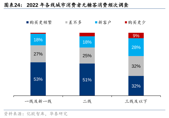 渠道端:三得利遵循线上、线下因地制宜的发展战略。三得利无糖茶进入中国已有30余年,主要可分为三个阶段:1)2020年之前三得利定位为小众茶饮料品类,主要市场集中在福建、浙江等南方地区,北方市场较为薄弱,三得利在北方市场主要通过汇源操盘,但因运作不当、导致压货与价盘混乱等问题;2)20-22年疫情期间,公司坚持做无糖茶品类并逐步调整渠道与策略,转向渠道精耕与品牌年轻化;3)23年疫情解封后,无糖茶品类需求迎来高速发展,一方面,三得利采取相对稳健的线下渠道策略,重点覆盖一二线核心城市,逐步拓展潜力城市,南方市场下沉较多,北方市场主要布局一二线城市和省会城市,三得利在线下渠道主攻CVS店和KA商超(全国各地较知名的CVS店均有覆盖),流通渠道布局相对较少;另一方面,三得利积极拥抱中国的数字化创新机遇,目前已形成包括传统电商、兴趣内容电商、即时零售电商在内的线上渠道布局,基于促销活动、居家囤货、兴趣种草、即时外送等不同的消费场景,与更多消费者分享优质的产品。
