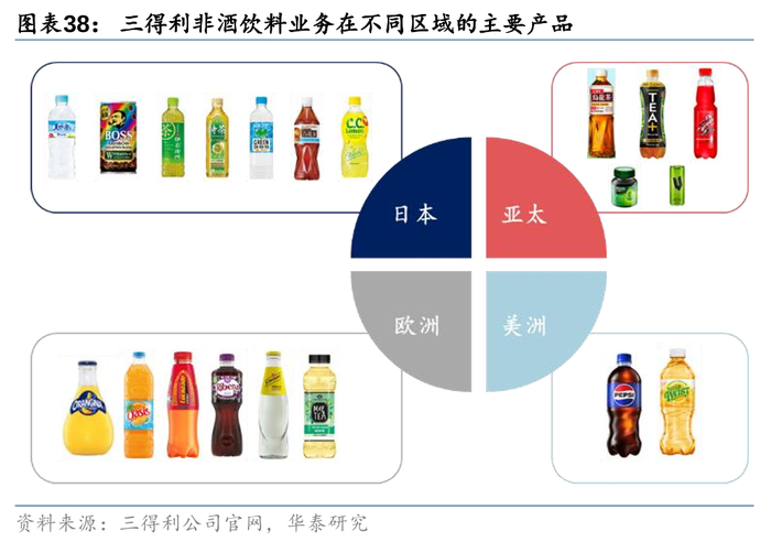 在消费习惯与日本接近的亚太国家,三得利积极出口强势品类,以中国为例,1997年三得利乌龙茶产品进入中国,系最早在中国开辟无糖茶饮料赛道的品牌之一,口味独特、具备差异化,成功实现单品突围;在消费习惯与日本差异较大的欧美地区,公司主要通过收并购或者与强势品牌(百事可乐等)合作。在美洲区域,公司主要销售以百事可乐为代表的碳酸饮料;在欧洲区域,公司的产品矩阵包括在英国销售的能量饮料Lucozade和黑加仑汁饮料Ribena,以及在法国销售的碳酸饮料Orangina,附带销售少量的茶饮料(如冰茶产品MayTea等);在亚太区域,公司主要销售即饮茶(在中国销售三得利乌龙茶,在泰国销售TEA+即饮茶等)与能量饮料V Energy(目前澳大利亚和新西兰最受欢迎的能量饮料之一)。