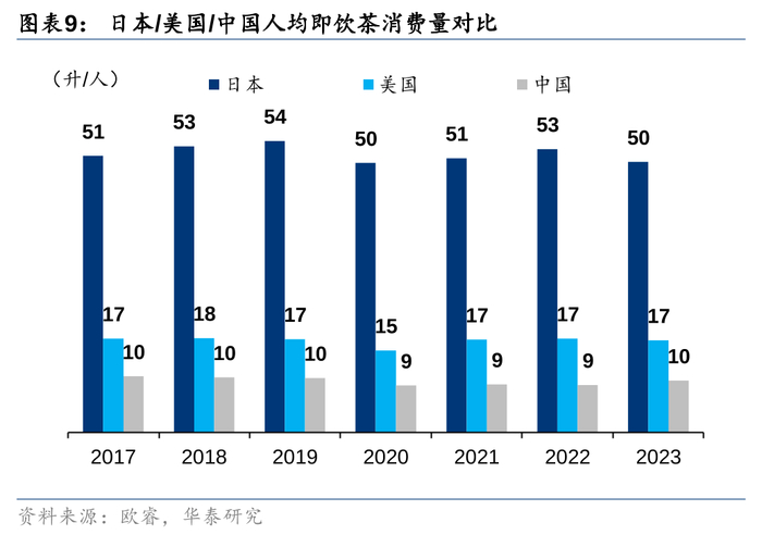 日本茶饮市场源于传统茶叶产业式微的背景下、业内企业的主动求变,承担了振兴传统产业的历史使命。一路走来,日本茶饮市场穿越周期,成就了传统产业衰退背景下的一抹星光。日本茶饮诞生于含糖饮料盛行的时代,突围过程中无糖化的标签功不可没,健康化基因贯穿前后,当前日本即饮茶市场以无糖茶为主,2018年起稳居日本软饮料第一大品类。据欧睿,23年日本人均即饮茶消费量为50升/人,远高于美国的17升/人,及同属亚太地区的中国(10升/人)。与中美等以高糖调味茶占据主导的市场不同,日本即饮茶市场中无糖茶占主流(无糖茶市场规模占比80%+)。据伊藤园推介材料,05年后日本即饮茶市场销售额稳定在万亿日元左右(约500亿人民币),18年起即饮茶超越即饮咖啡成为日本软饮料市场第一大品类。
