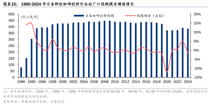 2)1980-1990年:“碳酸饮料→咖啡饮料”的功能化崛起。1980s是日本“泡沫经济”的加速演绎阶段,伴随写字楼文化兴起和居民工作节奏加快,消费者对“提神、恢复精力”的产品需求日益凸显。在此背景下,加糖、加奶的罐装咖啡扮演了“半功能饮品”的角色,既保留甜味满足了口感好喝的需求,又加入咖啡因迎合了精神振奋的诉求。同时,咖啡饮料企业在车站、写字楼附近大量铺设自动售货机,使得咖啡饮料在1980s实现迅猛增长。