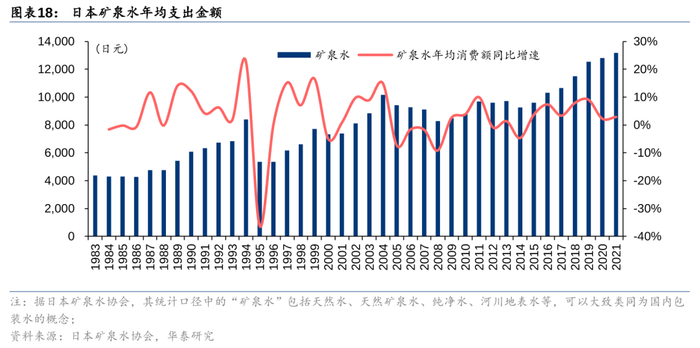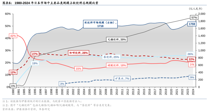 4)04年至今:品类结构交织更迭,无糖化驱动“有糖碳酸”转向“无糖碳酸”、“有糖咖啡”转向“无糖咖啡”,功能化驱动保健功能饮料焕发新活力,包装水的便捷属性带动水行业的包装化率不断提升。04年至今,日本软饮料行业依然呈现无糖化&功能化的趋势。一方面,碳酸饮料中无糖气泡水大幅替代有糖碳酸,咖啡消费者的主流选择亦从有糖咖啡切换至无糖咖啡;另一方面,特定保健用食品+机能性食品的政策逐步放宽,使得添加了膳食纤维、促进脂肪分解或调节肠道菌群的软饮新品层出不穷。此外,矿泉水市场规模在软饮料总规模中的占比也有所提升,虽然日本有直接饮用自来水的习惯,但消费者在口感上逐步接受瓶装水,且瓶装水的便捷属性与户外、上班携带等场景更加适配,日本水行业包装化率逐步提升。