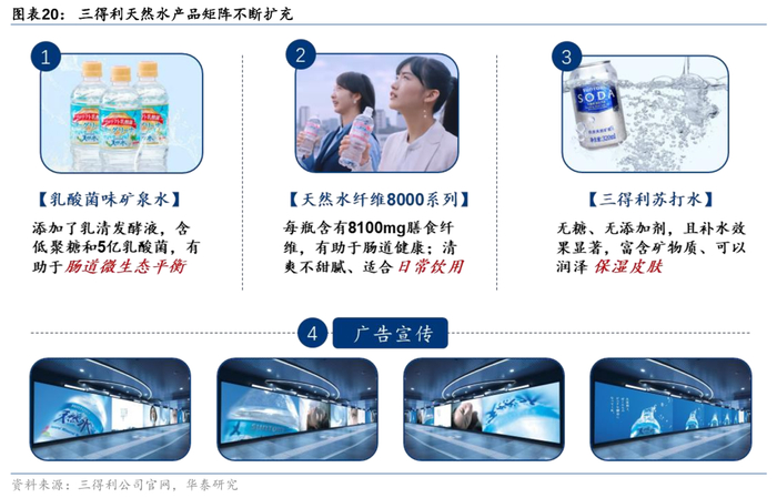 3)产品品类不断扩充:在传统矿泉水的基础上,三得利以“功能化”和“健康化”为主线、持续完善产品矩阵,乳酸菌味矿泉水、天然水纤维8000系列、三得利苏打水等相继面市。乳酸菌味矿泉水中添加了乳清发酵液,含低聚糖和5亿乳酸菌,有助于肠道微生态平衡;天然水纤维8000系列每瓶含有8100mg膳食纤维,同样有助于肠道健康;三得利苏打水为消费者提供了满满的气泡口感,无糖、无添加剂,满足消费者的健康化需求,且补水效果显著,可迅速补充体内水分,富含矿物质、可以润泽保湿皮肤。