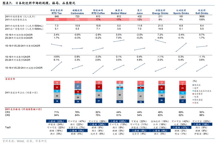 日本即饮茶是典型的寡头垄断市场,集中度较高。据欧睿,24年日本即饮茶市场终端销售额口径的CR5达95%,其中第一梯队为三得利/伊藤园/可口可乐,市占率分别为25%/24%/22%,三得利、伊藤园是日本本土龙头企业,也是80s最早开疆拓土的行业先驱;第二梯队为麒麟控股/朝日集团,市占率分别为18%/5%。日本优秀企业素以匠人精神闻名,旗下核心单品产品力突出,在某个子品类中一旦站稳脚跟、较难被新进者超越。随着日本国内市场陷入饱和,新入局者难以抢夺传统龙头打造的品牌护城河,龙头企业在各自的优势品类中均有长青大单品,在历经数十年的市场打磨后形成了较深的群众基础,为其赢得了稳固的市场份额。