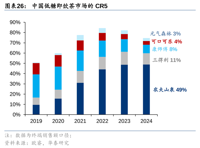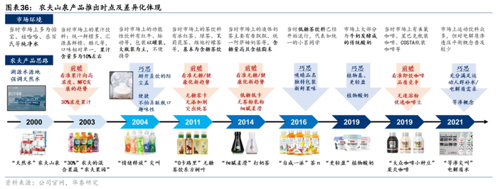看回国内市场,打造差异化概念是农夫山泉突出重围的竞争利器。在百舸争流、竞争激烈的中国软饮赛道,企业想要突出重围、取得相当的市场份额,内功修炼与对外宣传均需把握;不仅要提升自身产品端/渠道端的实力,也要别出心裁形成差异化的品牌形象以把握消费者心智。1)瓶装水(基本盘):00年农夫发起“天然水vs纯净水”之争、08年强调“水源地”概念、13年宣传“酸碱性”理论,均帮助公司在相应时期提升市占率、最终站稳瓶装水龙头地位;2)新曲线:即饮茶东方树叶强调“无糖更健康”的健康理念与“传统中国茶”的品牌形象,运动饮料尖叫主打“补充电解质”概念,果汁产品中率先普及“NFC”概念,农夫山泉相继打造出各品类中的大单品。总结来看,农夫山泉将自身产品与差异化概念相结合,在历经前期市场教育(造势)→产品概念打造(起势)→自身壁垒强化(稳固)三个阶段后,力求建立起更适合自身发展的市场氛围与竞争规则,于相应赛道中占据较为稳固的市场份额。