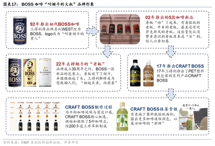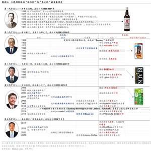 1)营销端:三得利通过市场调研、发现日本泡沫经济破裂后,中年体力劳动者为日本即饮咖啡主要的受众群体,因此BOSS咖啡始终以“劳动者的伴侣”为品牌核心,“叼烟斗的大叔”(公司营销及产品包装主要使用的品牌形象)起到了连接商品包装与劳动者内心的作用,但不同时代下“劳动者”的定义和需求发生了深刻变化,也促使三得利不断调整其营销策略。2)产品端:公司针对蓝领、白领、女性及不喝咖啡群体推出不同的产品,通过精准的人群战略、产品创新及情绪营销,成功将其塑造为日本国民级饮料产品。