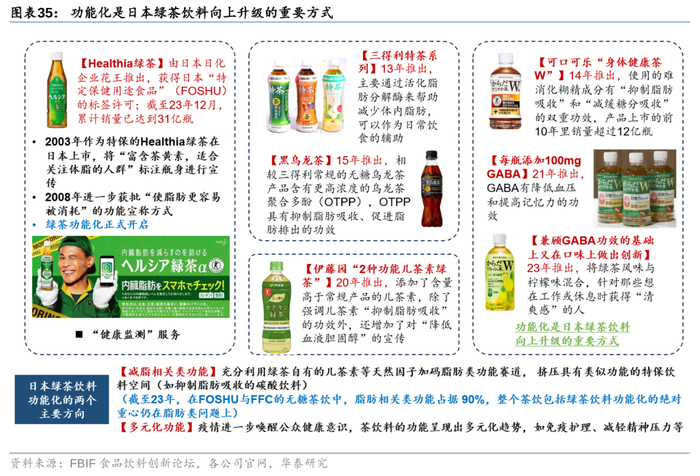 经验思考:强劲的研发实力是三得利贡献差异化产品(打造具备一定功能属性的特保茶饮料)、进而培育大单品的基本保障,使其拥有更长的产品生命周期。复盘三得利茶饮业务的发展历史,其不断满足消费者对口感的需要、不断追求容量及包装与消费场景的匹配、通过开发可加热容器缓解茶饮消费的季节性波动、以高端化和功能化拓展增量空间等。我们认为,功能化是日本绿茶饮料向上升级的重要方式,三得利同样关注到功能化饮品的发展潜力,但发现当时市场上多数特保绿茶饮料(获得日本“特定保健用途食品”的标签许可)的功能只是就餐时抑制脂肪吸收,2013年三得利进一步升级伊右卫门,推出可日常促进脂肪直接分解的特茶,打开日常消费时段,当年便成为了销量第一的特保饮料,2016年(上市3年)累计销量突破10亿瓶(据FBIF)。