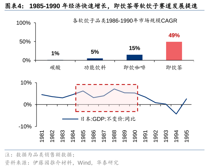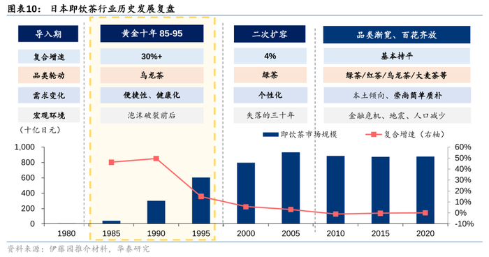 2)黄金十年(86-95年):受益于经济高增、健康化趋势对需求端的两重加速,黄金十年即饮茶市场销售额CAGR高达30%+,品类以乌龙茶为主,但伊藤园已突破技术壁垒推出罐装绿茶,为行业此后十年的二次扩容做足准备;