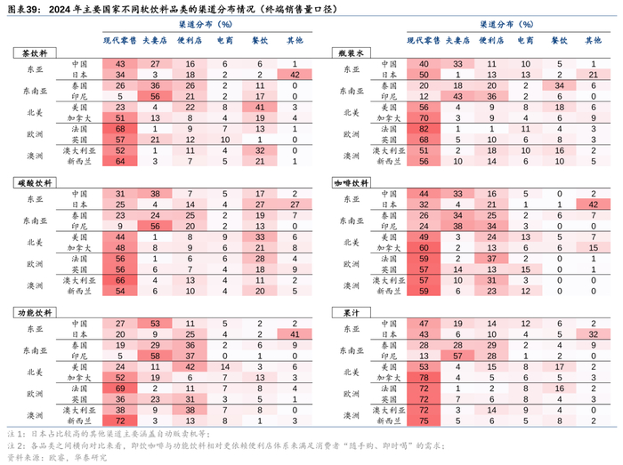 方法论归纳:中国软饮企业欲效仿三得利的国际化路径,需要在发达市场与新兴市场间灵活切换渠道打法。在发达国家可集中优势资源、拿下现代零售与便利店等高价值货架,打造品牌势能;在亚洲等新兴市场中,夫妻店、小型杂货铺在当地占据相当比例,即饮茶、瓶装水、功能饮料等品类均以夫妻店渠道为主,各软饮料企业需扎实地铺设经销体系、灵活开展线下促销与品牌活动,抢占更多夫妻店终端。我们认为,中国的软饮料企业或可携“精耕模式”走出国门,通过小批量高频配送、地面促销等手段,与本地经销商深度协作、扎实铺设终端,在亚洲各国(如东南亚等)的城市与城乡结合部打开局面,灵活应对碎片化的零售结构、从而形成对跨国巨头的差异化竞争优势。