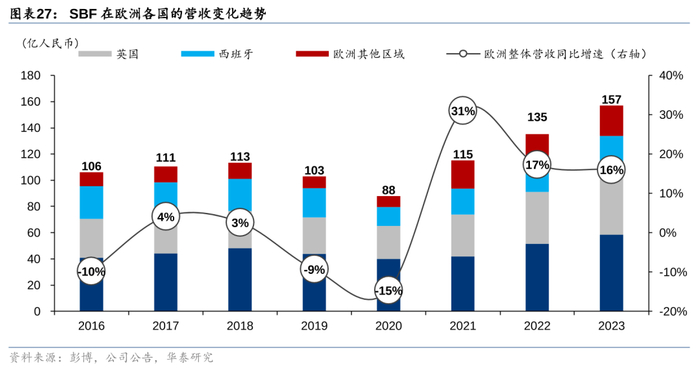 三得利在欧洲市场并购当地知名品牌,切入果汁/果味碳酸/功能饮料等赛道,目前的核心市场包括法国/英国/西班牙等;23年SBF在欧洲实现营收约157亿人民币,其中法国/英国/西班牙占比37%/29%/19%。09年三得利以约26亿欧元收购Orangina Schweppes,掌握碳酸饮料Orangina、史威士Schweppes、水果饮料绿洲Oasis 等知名饮料品牌,立足西欧市场并构筑了完善的分销网络;13 年三得利以约13亿英镑从葛兰素史克手中收购了Lucozade(功能饮料)和Ribena(黑加仑果汁饮料),强化在英国市场的竞争优势。