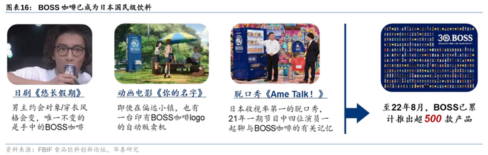 据FoodTalks,22年BOSS咖啡的年销量超1亿箱,目前在日本即饮咖啡品类销量排名第一、软饮料品类销量排名第二,我们从营销与产品两个层面解读三得利的竞争优势: