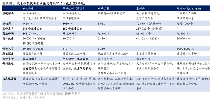 看回国内市场,由于饮料具备就近购买的属性,因此广而深的渠道布局有利于产品更大程度地触达消费者,带来购买需求。康师傅作为渠道精耕的先驱、当前覆盖的终端网点数量领先,农夫山泉经销商网络广而深、团队综合素质靠前,东鹏饮料业务团队积极性较高、数字化体系赋能渠道。1)康师傅:1999年推行渠道精耕,2019年开启直营二阶改革,缩减渠道链路,经销商/直营客户数量较多,截至23年底,覆盖终端网点数量超400万个,在软饮料企业中处于领先地位。2)农夫山泉:公司与经销商多年建立起稳定的合作关系,在维系自身健康增长的同时保障经销商的利润水平,此外,公司逐步构建起涵盖产、销、供全环节的信息化系统,供应链管理效率及终端渠道掌控能力稳步提升。3)东鹏饮料:邮差体系保障全国化顺利推进,数字化管理水平领先,“一元乐享”扫码系统赋能全链路管理。我们认为,国内软饮料龙头企业均已在我国国内建立起领先的渠道优势,后续在出海过程中,或可在渠道结构与我国更接近的新兴市场国家充分利用自身在“渠道精耕”上的经验优势。