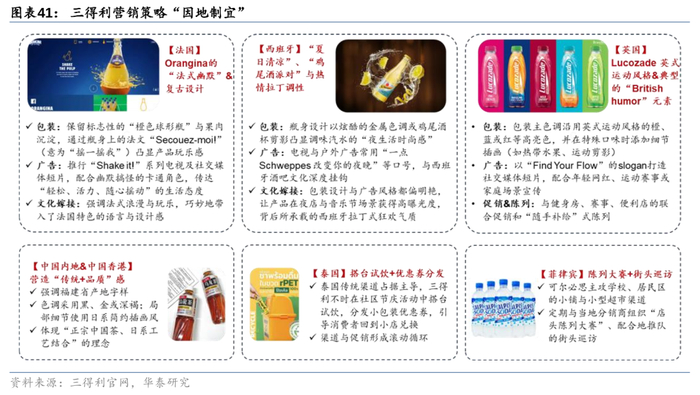 经验思考:渠道策略因地制宜,三得利一面深度绑定发达国家的现代零售渠道,一面广泛覆盖新兴市场的多元零售渠道,多维度保障三得利在全球范围内的高效铺货。1)欧美发达国家:在便利店、现代零售体系完善的欧美发达国家,品牌商往往以统一的采购谈判、促销规划和品牌陈列为突破口,通过高频的新品上架与一站式广告投放迅速触达消费者。故在欧美市场,三得利主要聚焦现代商超与大规模渠道谈判,借助精品陈列(店内堆头+季节性主题陈列)、高频促销及联合营销等方式实现品牌曝光。此外,在细分的餐饮渠道,三得利亦有亮眼的表现。以法国为例,三得利抓住法国人对鸡尾酒与餐饮搭配的偏好,在酒店、餐厅、咖啡馆等场景大力推广Schweppes作为调味汽水基底,实现产品与渠道的充分适配。2)亚洲/中东非洲等新兴市场:大量夫妻店、杂货小铺依旧占据重要的零售份额,品牌商更依赖密集的地面推广与经销商网络。故三得利在进入东南亚等地时,除了将日本的便利店经验灵活地移植到当地城市核心区域外,更通过招募本地化的分销合伙人、频繁的小批量配送、人群聚集地的地推活动等方式,来渗透大量分散的夫妻店网络。