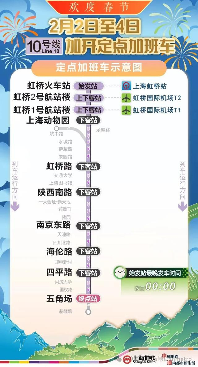 10号线虹桥火车站站往五角场站方向:10号线在虹桥火车站站常态定点加班车(23:00)后加开4列定点加班车,加班车停靠虹桥火车站站、虹桥2号航站楼站、虹桥1号航站楼站、上海动物园站、虹桥路站、陕西南路站、南京东路站、海伦路站、四平路站、五角场站(终点站),其余车站跳停。停靠车站中,虹桥火车站站(始发站),虹桥2号航站楼站、虹桥1号航站楼站办理上下客,其余车站只下不上。