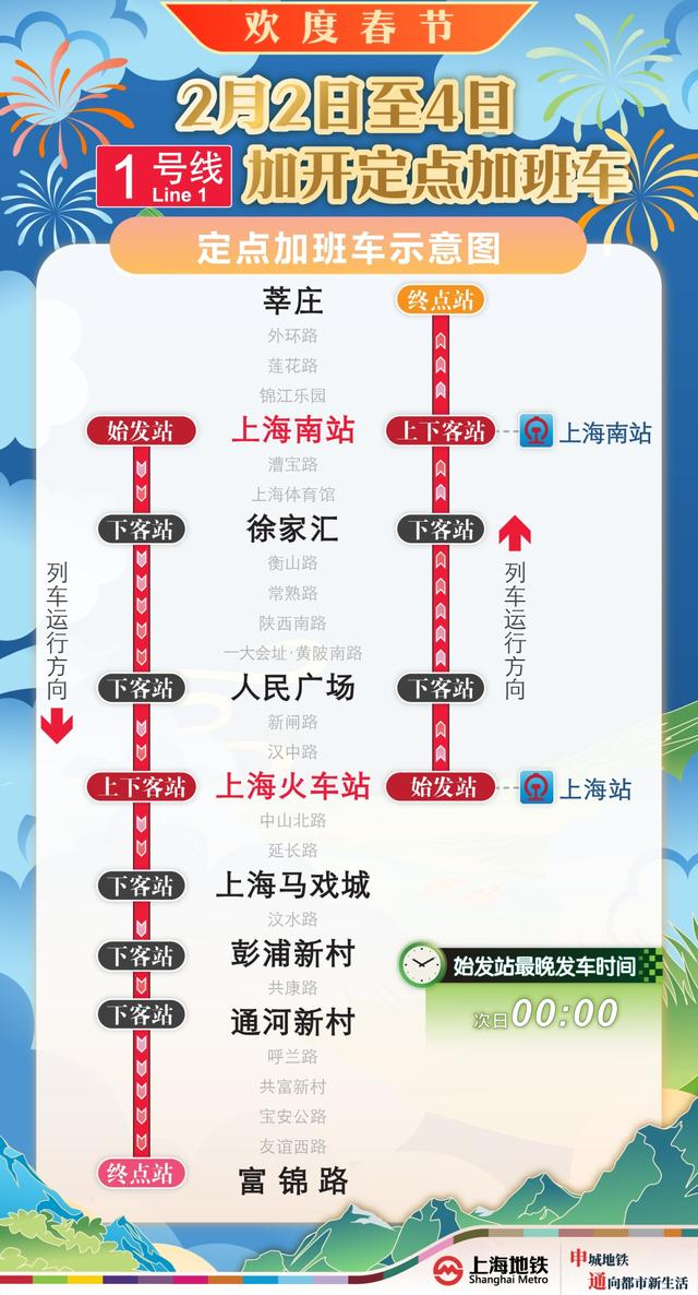 1号线上海南站站往富锦路站方向:在上海南站站末班车(22:42)后加开4列定点加班车运行至富锦路站,加班车停靠上海南站站、徐家汇站、人民广场站、上海火车站站、上海马戏城站、彭浦新村站、通河新村站、富锦路站(终点站),其余车站跳停。停靠车站中,上海南站站(始发站)、上海火车站站办理上下客,其余车站只下不上。