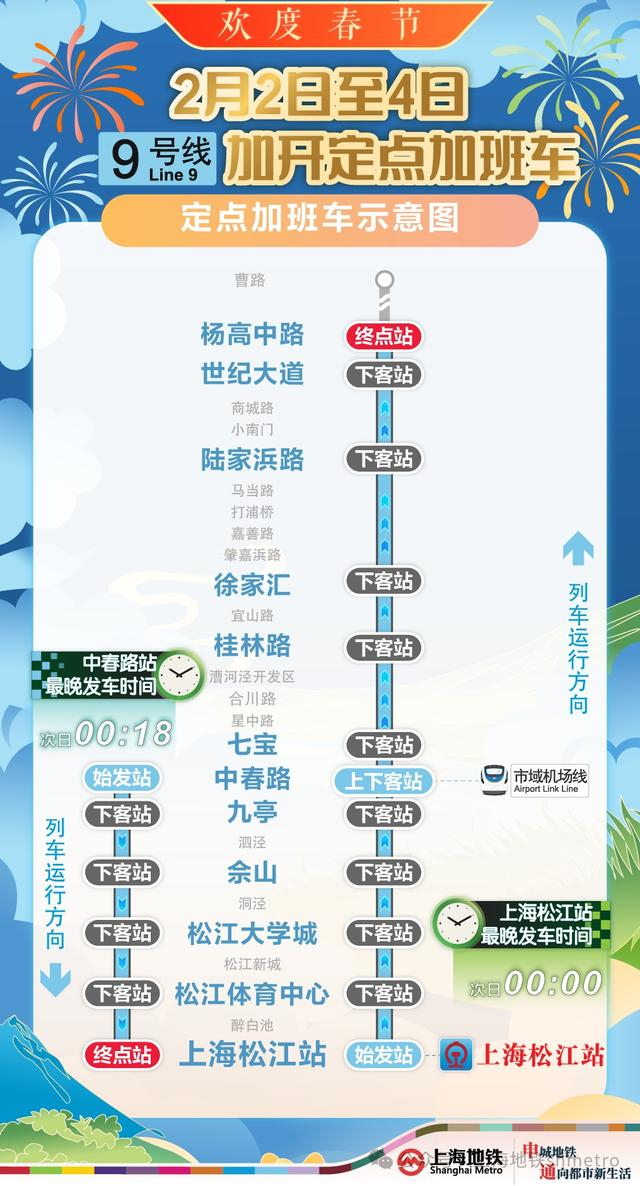 9号线中春路站往上海松江站站方向:9号线在中春路站下行末班车(23:39)后加开2列定点加班车,加班车停靠中春路站、九亭站、佘山站、松江大学城站、松江体育中心站、上海松江站站(终点站),其余车站跳停。停靠车站中,中春路站(始发站)办理上下客,其余车站只下不上。