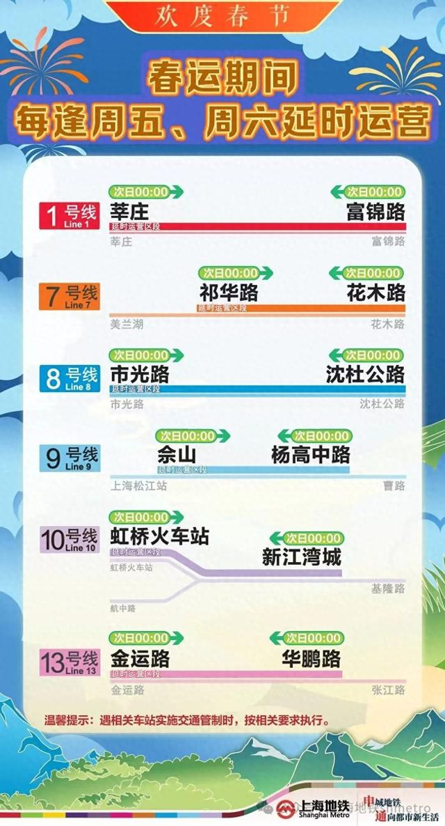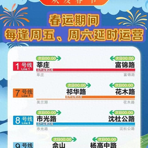 为满足“春运”期间乘客夜间出行需求,缓解中心城区夜高峰休闲、购物客流密集的压力,并最大限度地满足乘客节日出行的需求,春运期间逢周五、周六,上海地铁1、7、8、9、10、13号线将执行常态周末延时运营方案。