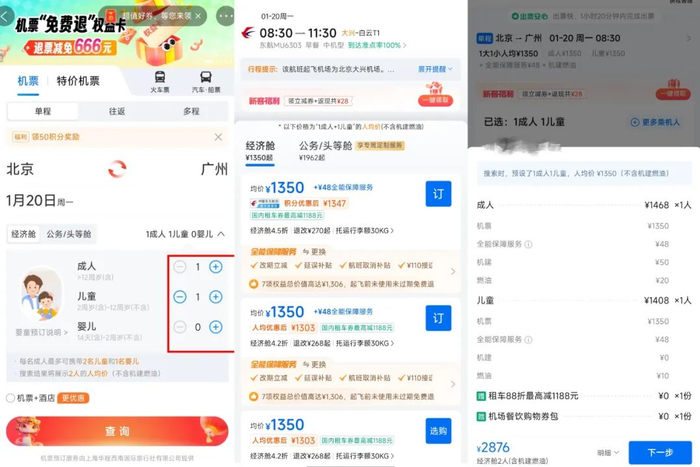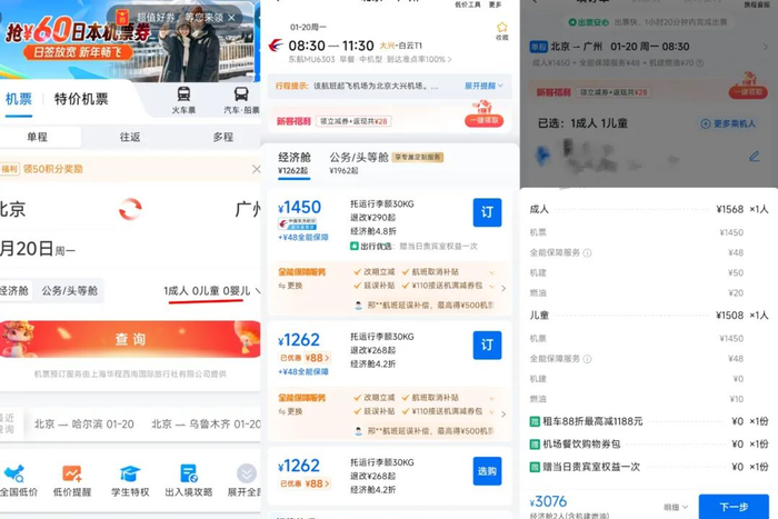潘哥登录携程之后,选择北京飞广州的同一航班,机票首页默认为1成人,直到订票选择乘机人时,才输入一大一小身份信息,最终显示票价均为1450元。