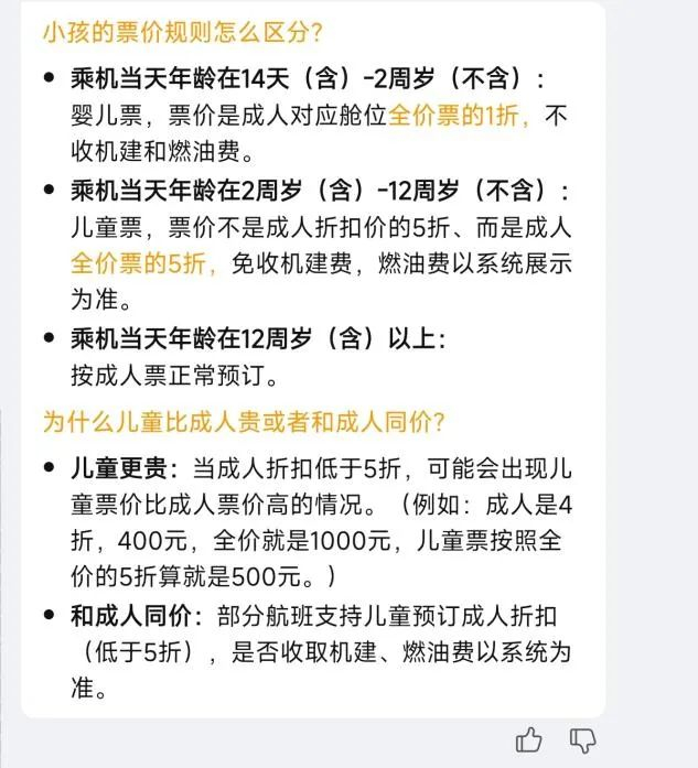 这样看来,当飞机成人票价低于5折时,儿童票可能比成人票更贵;而部分航班支持儿童预订成人票,可以避免出现倒反天罡现象。