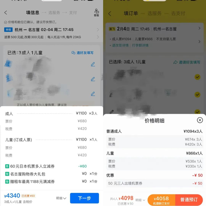 他打开携程App后,以系统默认的1成人身份,查询杭州飞名古屋的机票,发现三位成人的票价,是680元;一位儿童的票价,也是680元。
