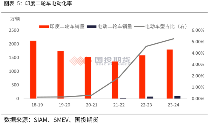 出于减少对于化石能源的依赖和保护环境的目的,印度于2015年制定了FAME计划,以促进印度采用电动或混合动力汽车。在FAME-I和FAME-II (《混合动力车和电动汽车的快速采用和制造计划》)的补贴鼓励下,2023财年汽车的电动化率迈过2%,二轮车的电动化率5.2%。