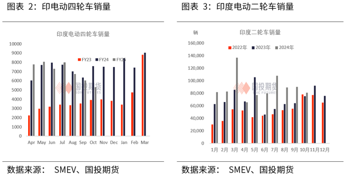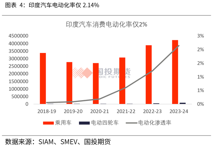 根据SMEV和SIAM数据,2023-2024财年,印度乘用车销量421.87万辆,同比增8.45%;商用车销量96.79万辆,同比增幅仅0.56%。而2023财年电动四轮车销量同比增90%至9.04万辆,占汽车总销量的2.14%。