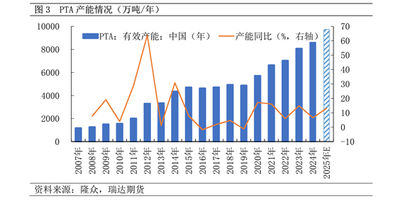 数据看点一:PTA处于产能投放期,2025年产能增速达13%