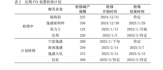 PTA仍处于产能扩张周期。去年12月独山能源三期300万吨PTA装置顺利投产出料,截止2024年底,PTA年产能为8602.5万吨,同比涨幅6.63%。2025年预计投产海伦石化3#、福海创二期以及虹港石化三期,共计860万吨PTA产能新增,总体产能同比2024年预计将上升13.14%。近期PTA预计无新增投产,PTA产量供应需要关注检修计划和现有装置的负荷变动。