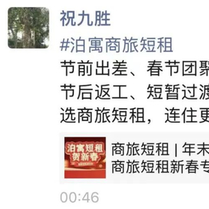 在这则朋友圈中,祝九胜转发一则宣传泊寓短租业务的推文,并配文称“节前出差、春节团聚、节后返工、短暂过渡,选商旅短租,连住更实惠~”。