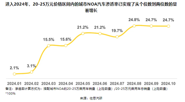 报告指出,从2022年到2024年,城市NOA功能由30万以上车型市场逐渐普及到10-25万级。佐思数据显示,2024年10月,20-25万元价格区间内的城市NOA汽车渗透率已经达到了24.7%,而在“15-20万元”的主流汽车细分市场中,已有五款车型实现了城市 NOA的规模化落地。小鹏Mona M03、小鹏P7+、深蓝L07都成功搭载了城市NOA功能。