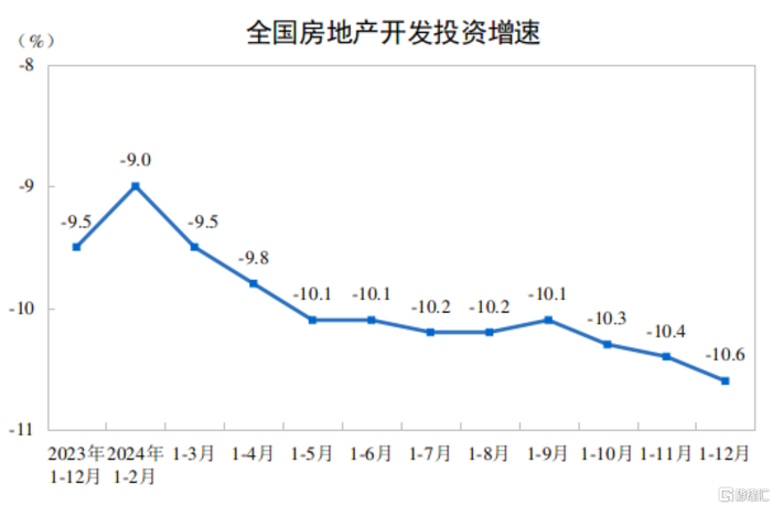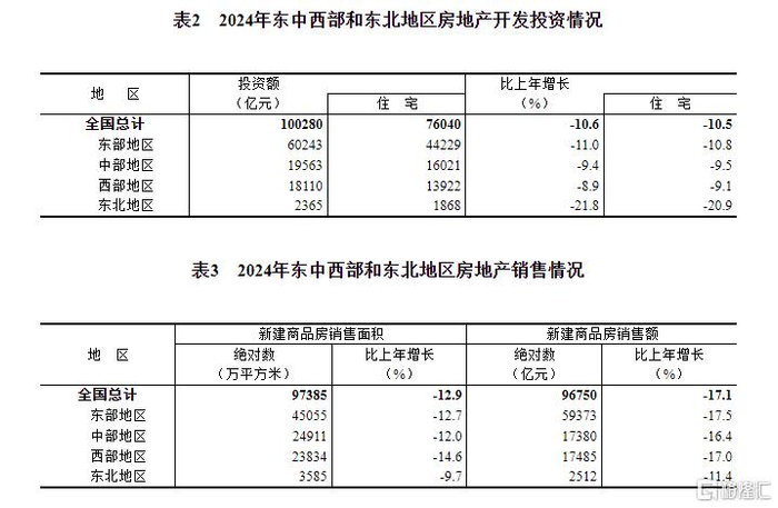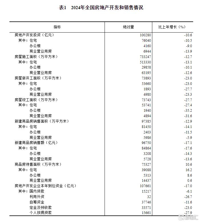 2024年,全国房地产开发投资100280亿元,比上年下降10.6%(按可比口径计算,详见附注6);其中,住宅投资76040亿元,下降10.5%。
