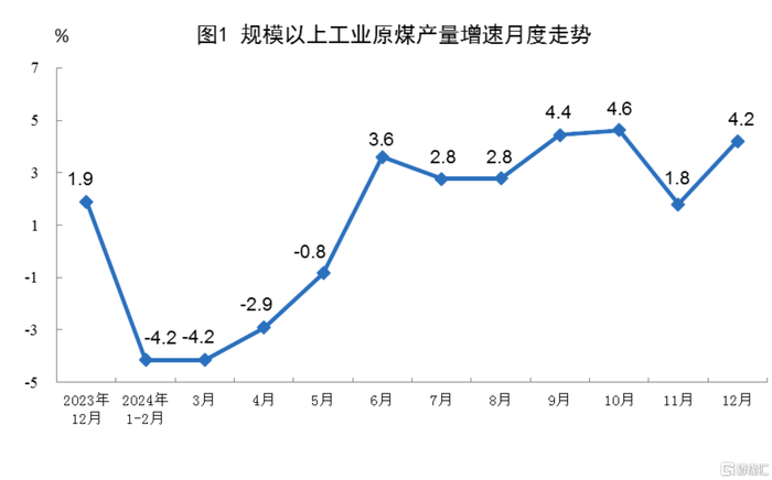 原煤生产增速加快。12月份,规上工业原煤产量4.4亿吨,同比增长4.2%,增速比11月份加快2.4个百分点;日均产量1415.6万吨。进口煤炭5235万吨,同比增长10.9%。