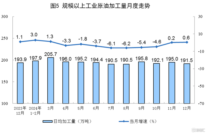 原油加工保持稳定。12月份,规上工业原油加工量5935万吨,同比增长0.6%,增速比11月份加快0.4个百分点;日均加工191.5万吨。2024年,规上工业原油加工量70843万吨,同比下降1.6%。