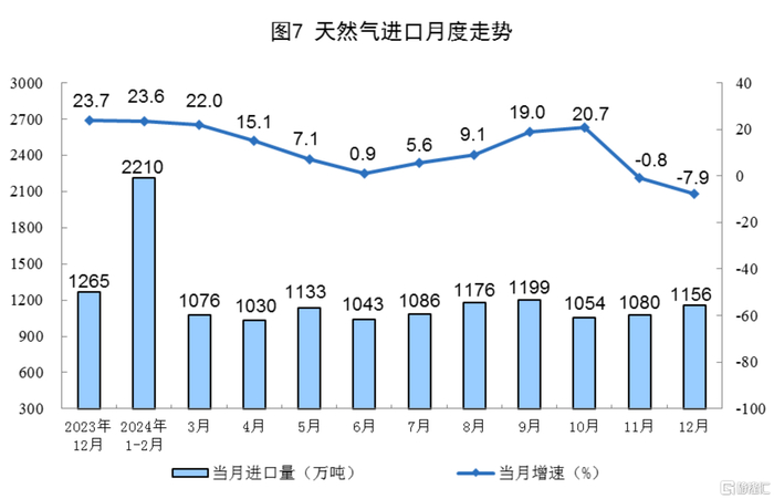天然气生产稳步增长。12月份,规上工业天然气产量218亿立方米,同比增长3.6%,增速比11月份加快0.5个百分点;日均产量7.0亿立方米。进口天然气1156万吨,同比下降7.9%。