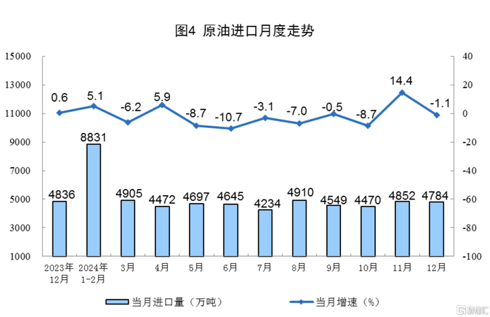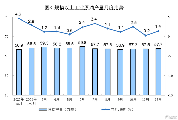 原油生产增速加快。12月份,规上工业原油产量1790万吨,同比增长1.4%,增速比11月份加快1.2个百分点;日均产量57.7万吨。进口原油4784万吨,同比下降1.1%。