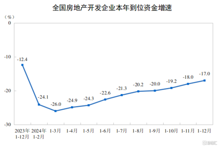 2024年,房地产开发企业到位资金107661亿元,比上年下降17.0%。其中,国内贷款15217亿元,下降6.1%;利用外资32亿元,下降26.7%;自筹资金37746亿元,下降11.6%;定金及预收款33571亿元,下降23.0%;个人按揭贷款15661亿元,下降27.9%。
