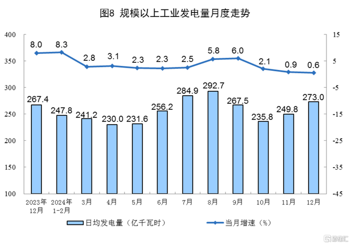 规上工业电力生产平稳增长。12月份,规上工业发电量8462亿千瓦时,同比增长0.6%;规上工业日均发电273.0亿千瓦时。2024年,规上工业发电量94181亿千瓦时,同比增长4.6%。