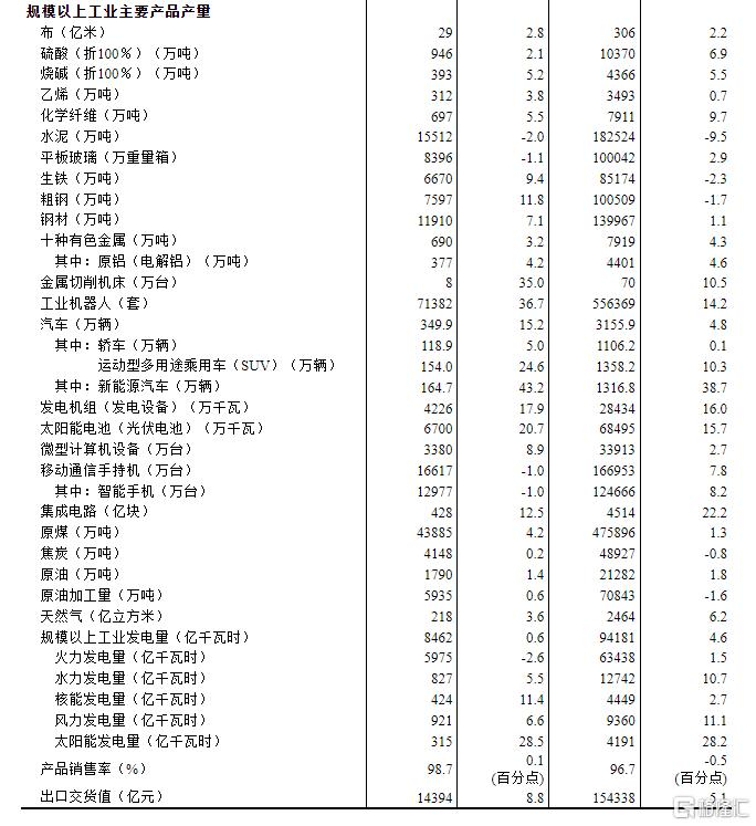 分产品看,12月份,规模以上工业619种产品中有396种产品产量同比增长。其中,钢材11910万吨,同比增长7.1%;水泥15512万吨,下降2.0%;十种有色金属690万吨,增长3.2%;乙烯312万吨,增长3.8%;汽车349.9万辆,增长15.2%,其中新能源汽车164.7万辆,增长43.2%;发电量8462亿千瓦时,增长0.6%;原油加工量5935万吨,增长0.6%。