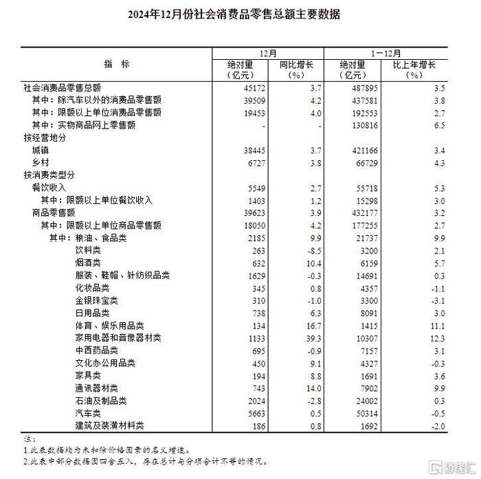 12月份,社会消费品零售总额45172亿元,同比增长3.7%。其中,除汽车以外的消费品零售额39509亿元,增长4.2%。2024年,社会消费品零售总额487895亿元,比上年增长3.5%。其中,除汽车以外的消费品零售额437581亿元,增长3.8%。