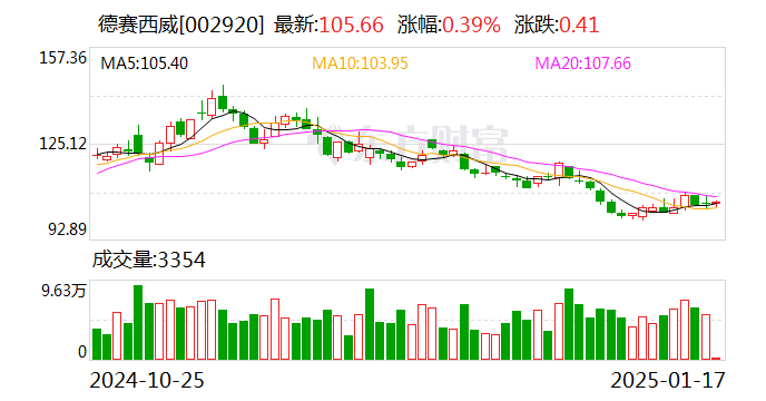 德赛西威1月16日收盘价为105.25元/股,涨幅0.81%,总市值584.09亿元。