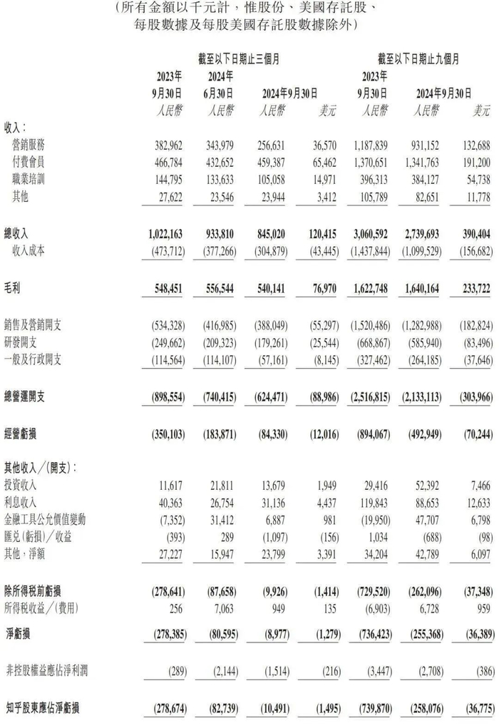 知乎近日公布了其截至2024年9月30日的季度财务报告