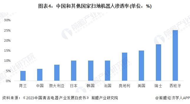 目前服务机器人市场中,清洁机器人占据主要份额,而扫地机器人是清洁机器人中使用率较高的产品。《2023中国清洁电器产业发展白皮书》数据显示,我国在全球范围内的扫地机器人渗透率仍然较低,其中渗透率较高的西班牙为25%,但主要以惯导等中低端产品为主。较为成熟的美国市场,扫地机渗透率达到15%,日韩地区则为10%左右,海内外地区仍有较大提升空间。