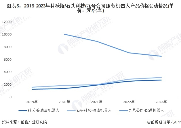 从我国服务机器人领域龙头企业科沃斯、石头科技以及九号公司的主要产品价格来看,近几年服务机器人产品市场价格整体涨跌不一。2019-2023年,科沃斯、石头科技两家扫地机器人价格总体上涨,2023年均价接近3000元/台套,而九号公司商用配送机器人价格不断下跌,2023年均价6483.2元/台套。