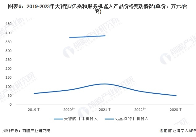 对于医疗/特种机器人市场,由于面向特殊场景,设备通常较大,价格也较为昂贵。且由于下游需求受招投标项目影响,价格波动明显。亿嘉和巡检机器人均价在50-100万元左右,天智航手术机器人均价在300万元以上。