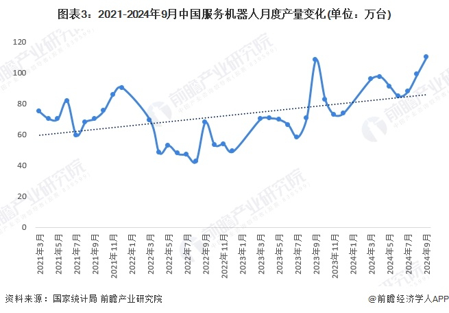近年来国内服务机器人产量迅猛增长。根据国家统计局披露的数据,2020-2023年,中国服务机器人产量波动增长,其中2021年是中国服务机器人产业爆发式增长的一年,全年产量达到921.44万台,同比增长48%。2023年,全国服务机器人产量为783.3万台,尽管相较于2021年有所下降,但仍维持在较高水平。2024年1-9月,全国服务机器人产量达到783.4万台,已超过2023年全年产量。