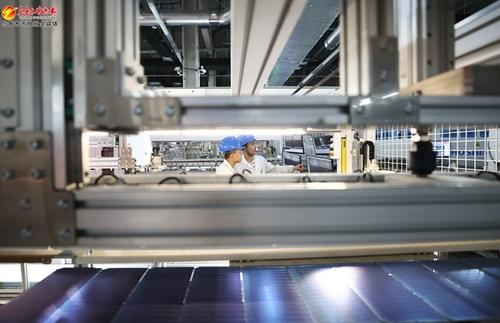 2024年7月9日,在甘泉堡经开区(工业区)新疆中部合盛硅业有限公司组件车间,工作人员正在进行光伏组件的生产。每天,约2.5万块光伏组件从这里出生。资料图片