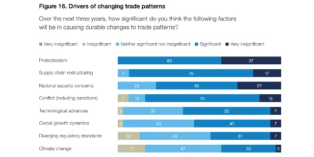 拖累全球经济的一大因素在于碎片化。报告称,经济碎片化趋势已成为影响全球经济的重要变量。94%的经济学家预计未来三年商品贸易将进一步碎片化,同时劳动力流动性和技术数据转移也面临更高壁垒。