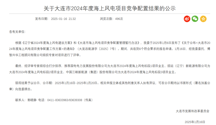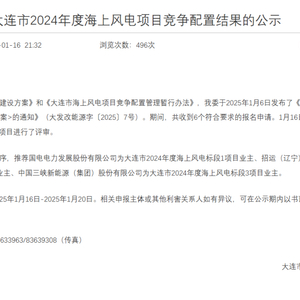 「风电之音」获悉,1月16日,辽宁大连市发布《关于大连市2024年度海上风电项目竞争配置结果的公示》。
